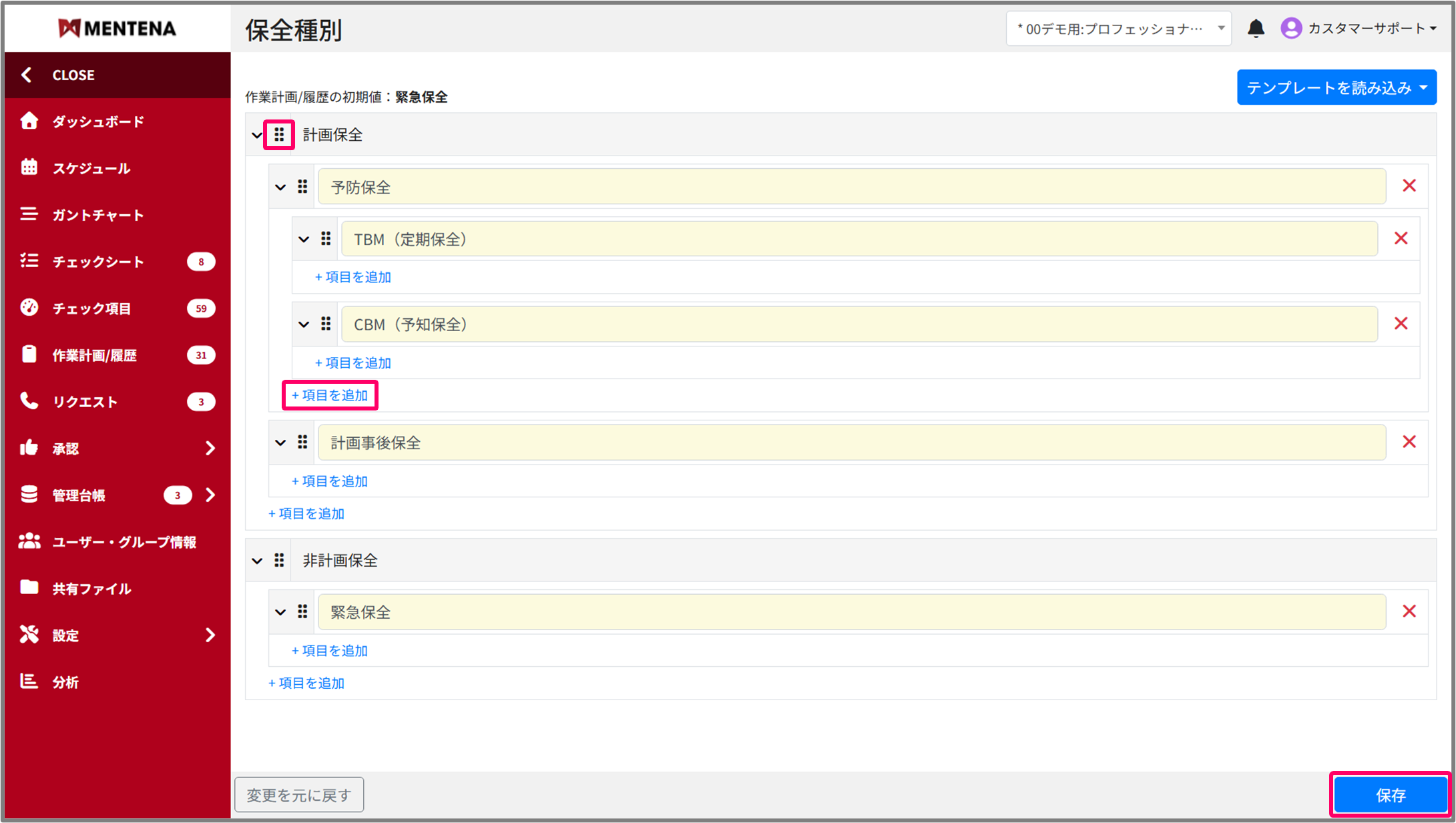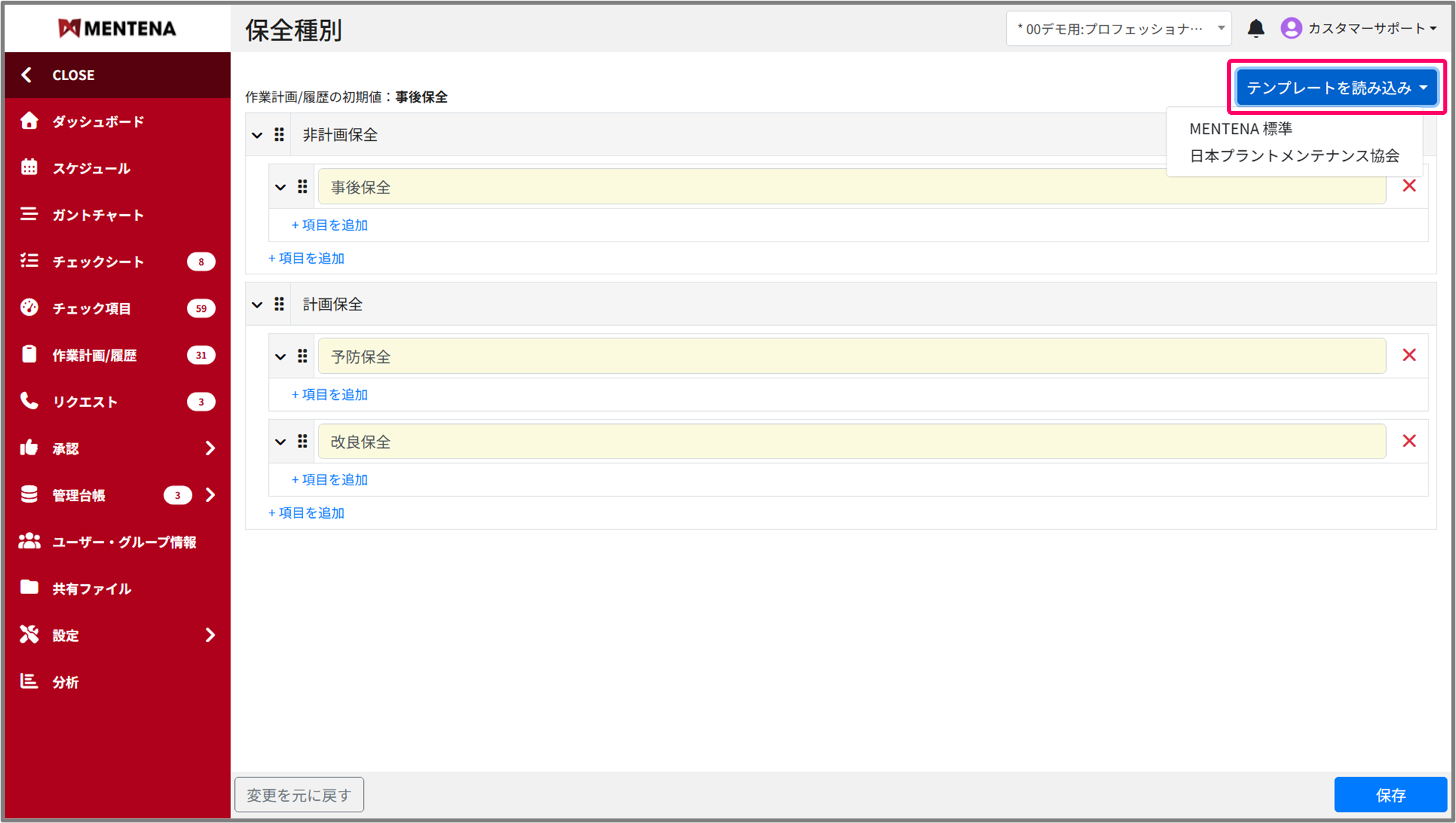 カスタマイズした保全種別を修正する際に画面右上の「テンプレートを読み込み」を使用することで、「MENTENA標準」の種別などに戻すことが可能です。