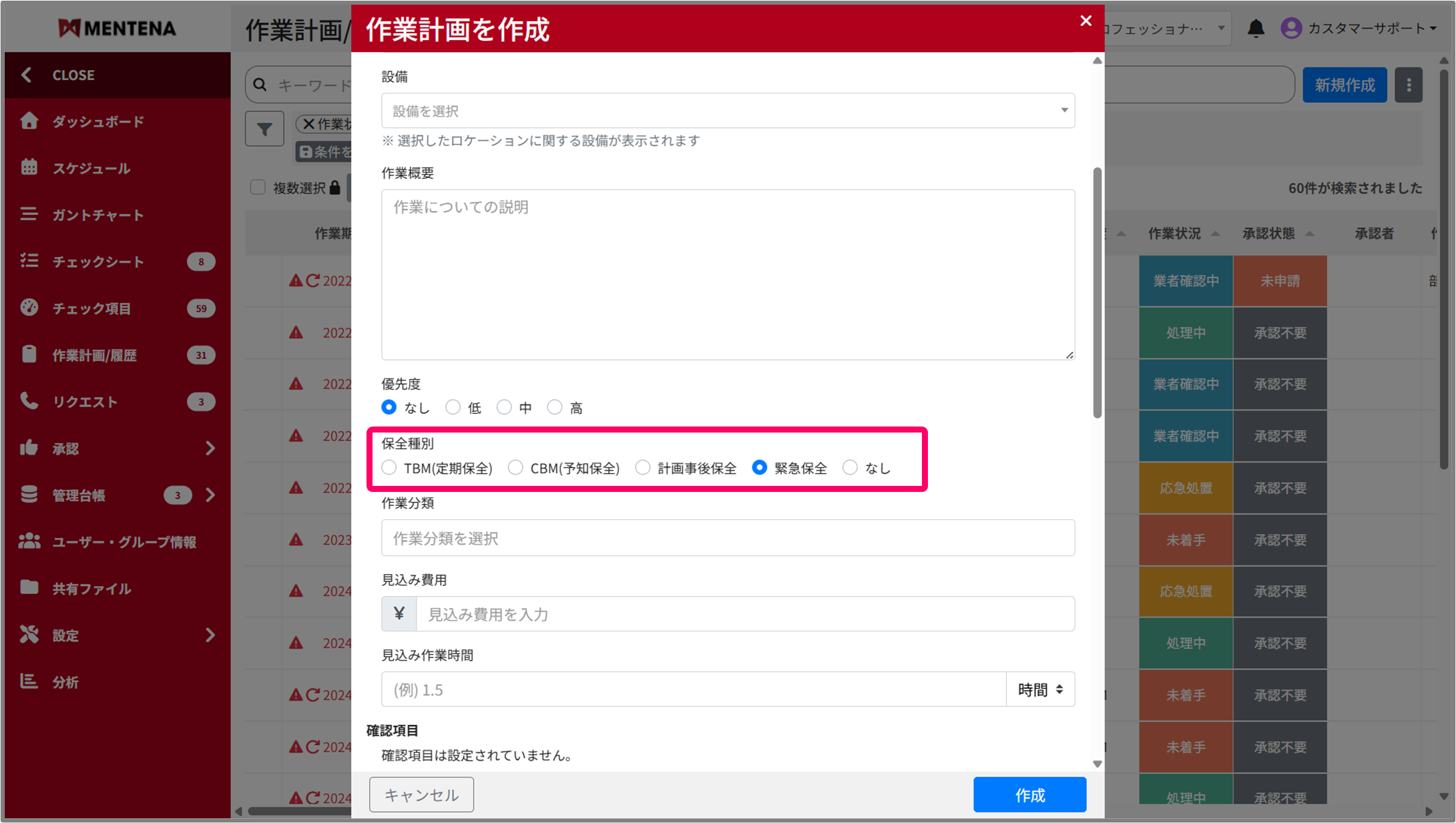 作業計画/履歴の作成時や編集時にカスタマイズした保全種別が適用されます。