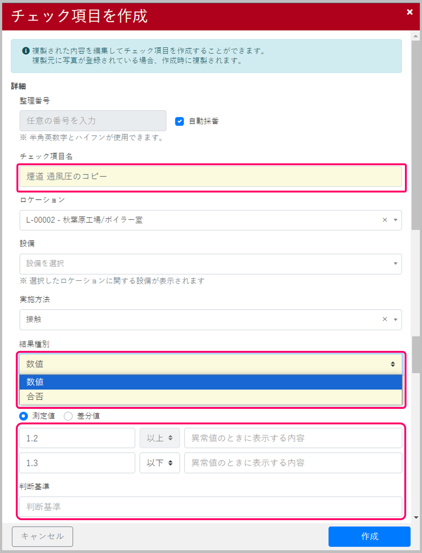 そのため、合否だったものを数値に変更したり、反対に数値だったものを合否に変更したりするには、該当のチェック項目を作成しなおす必要があります。