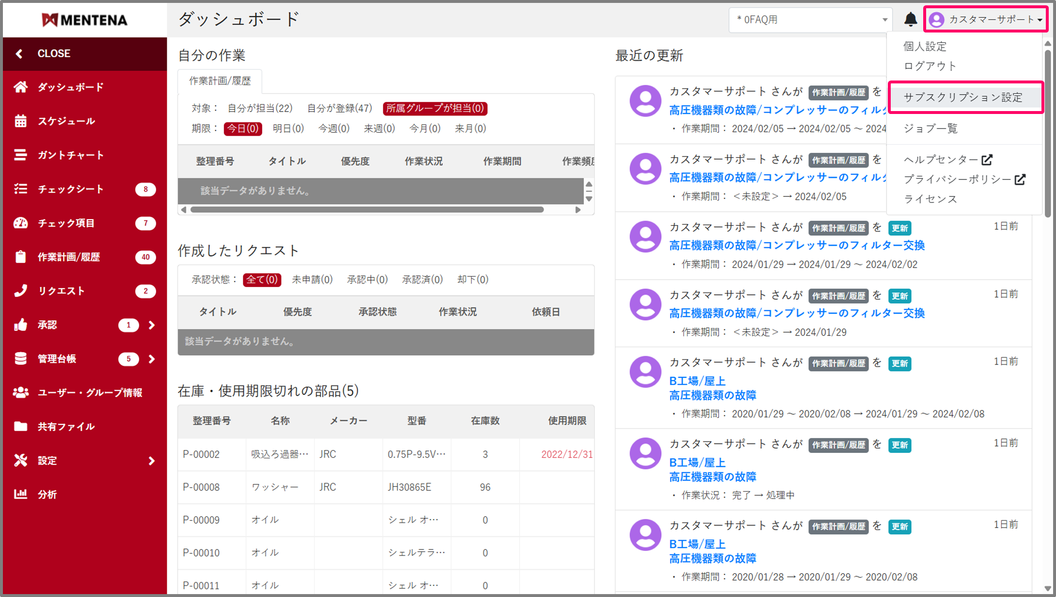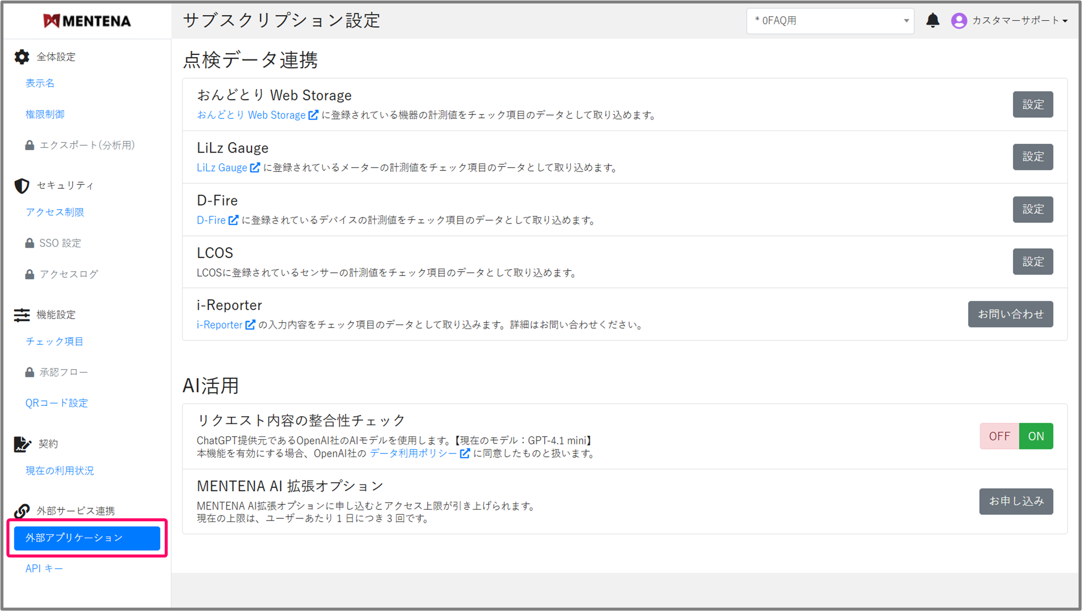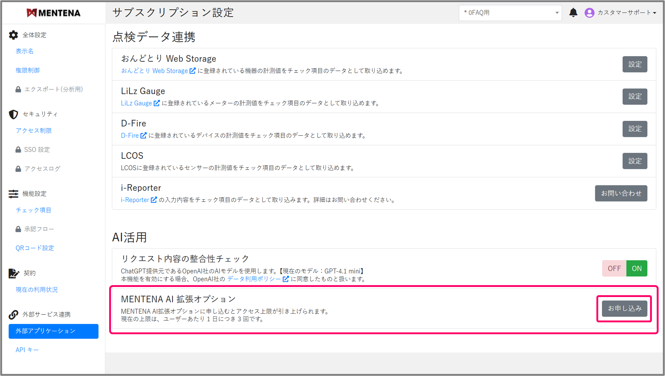 利用回数の上限を拡張したい場合は、サブスクリプション管理画面の「MENTENA AI 拡張オプション」の「お申し込み」ボタンより、お申し込みください。