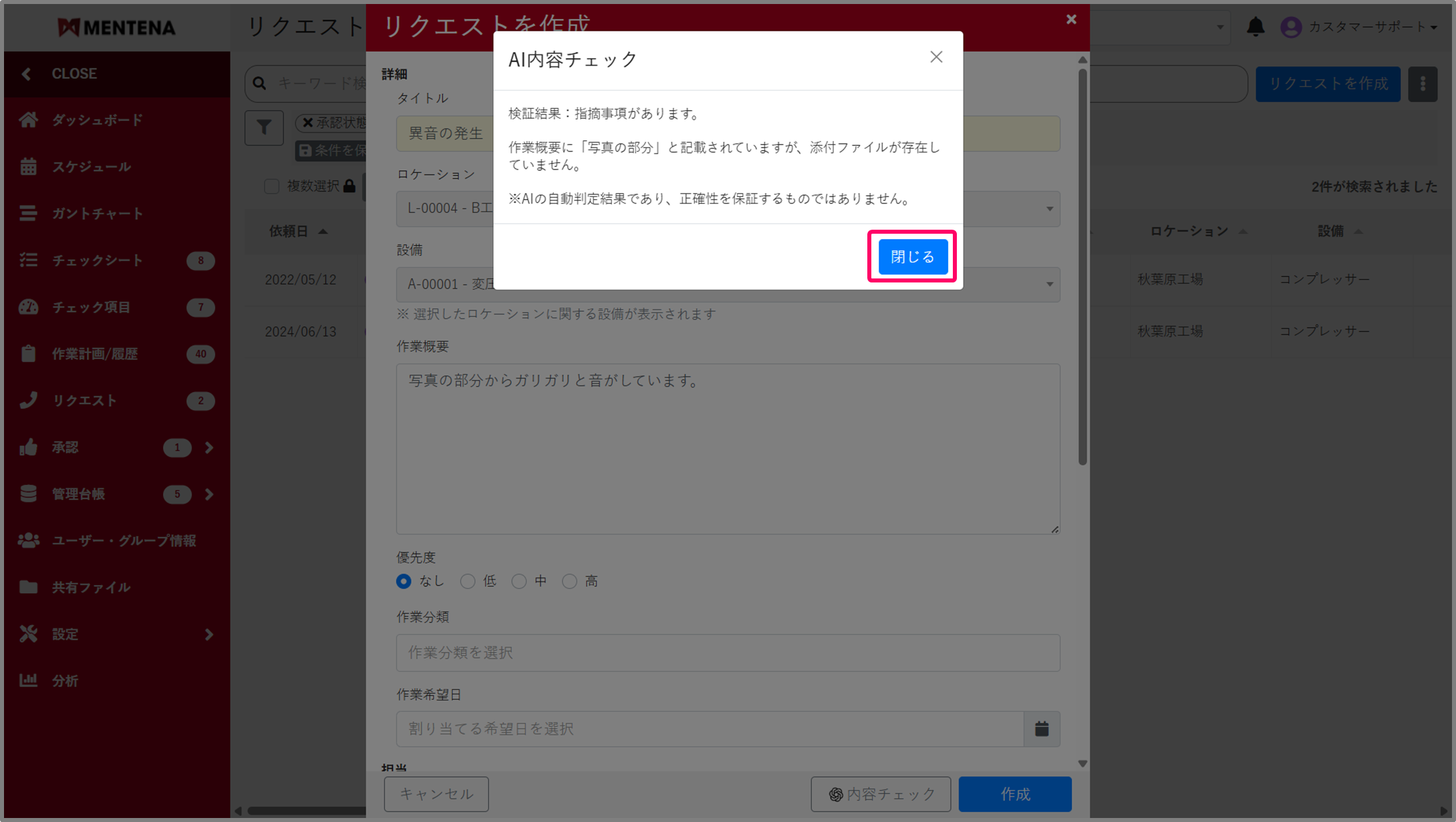 内容を確認したら「閉じる」を選択して、必要に応じて編集を行い、リクエストを作成してください。