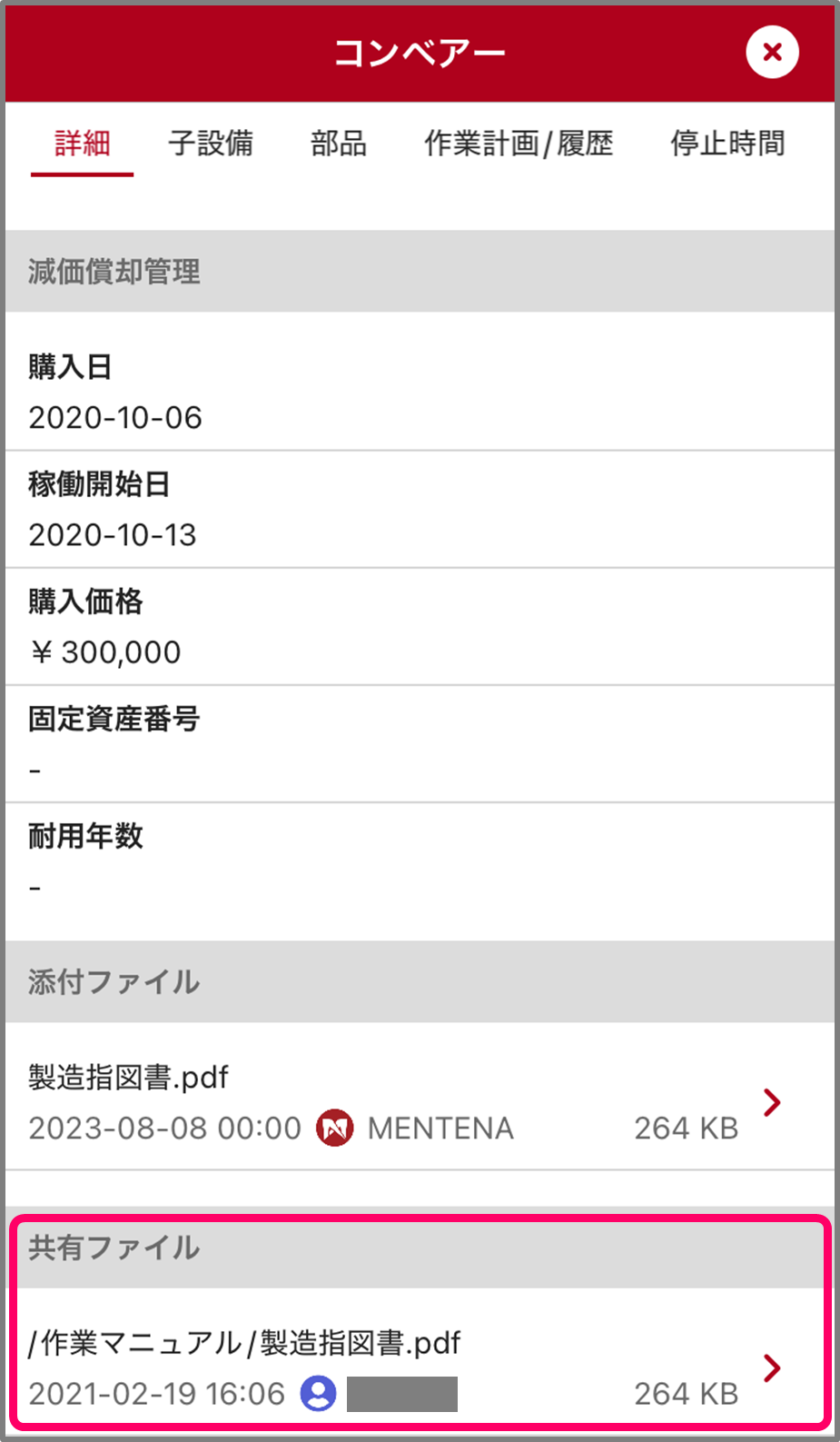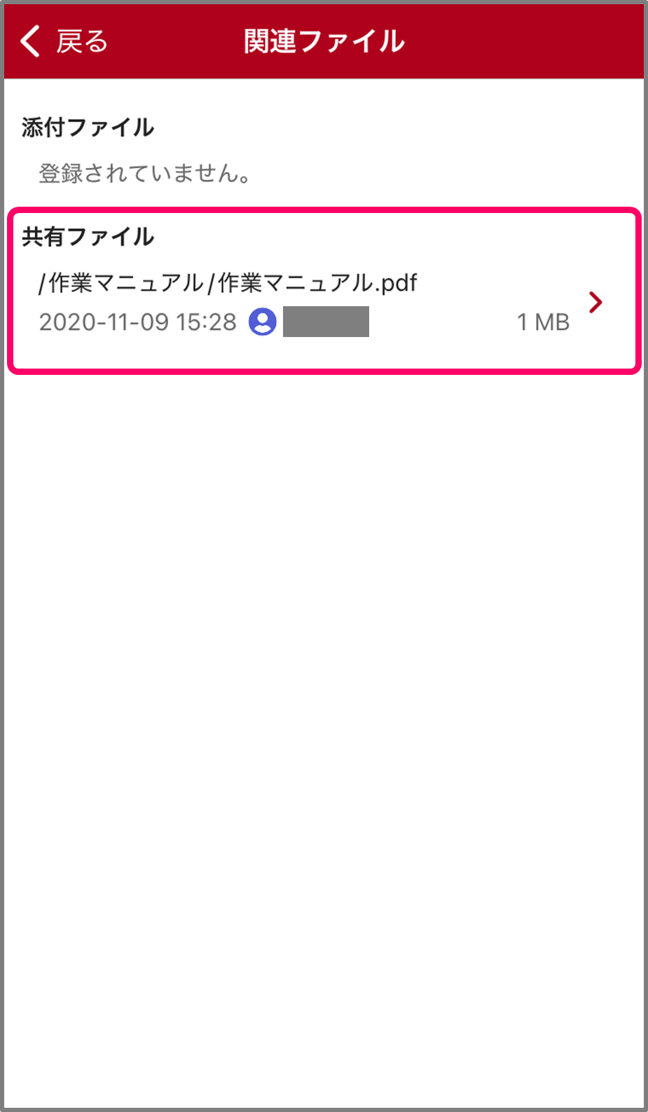「詳細」タブの下部にある「共有ファイル」から閲覧したいファイルをタップしてください。