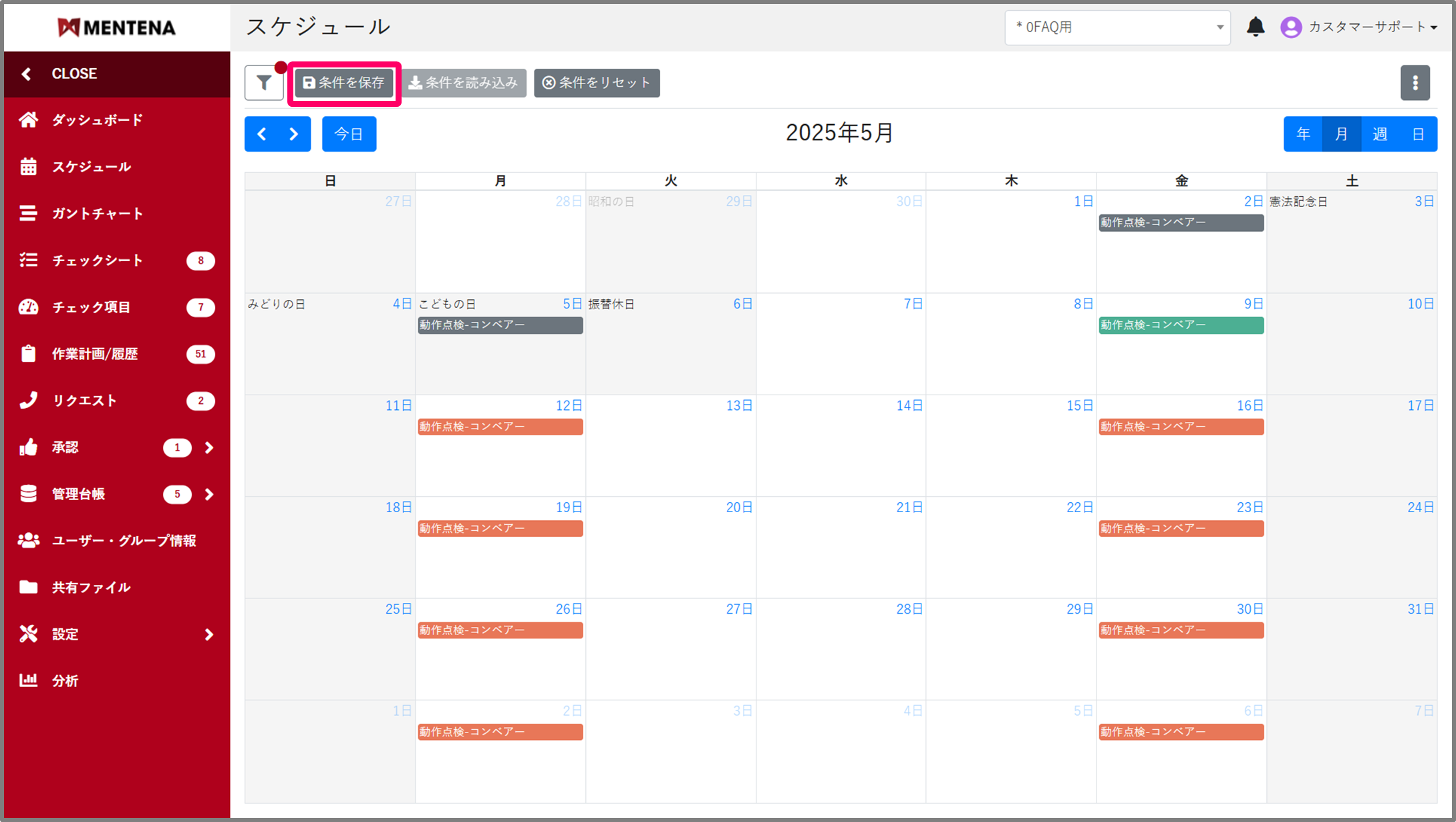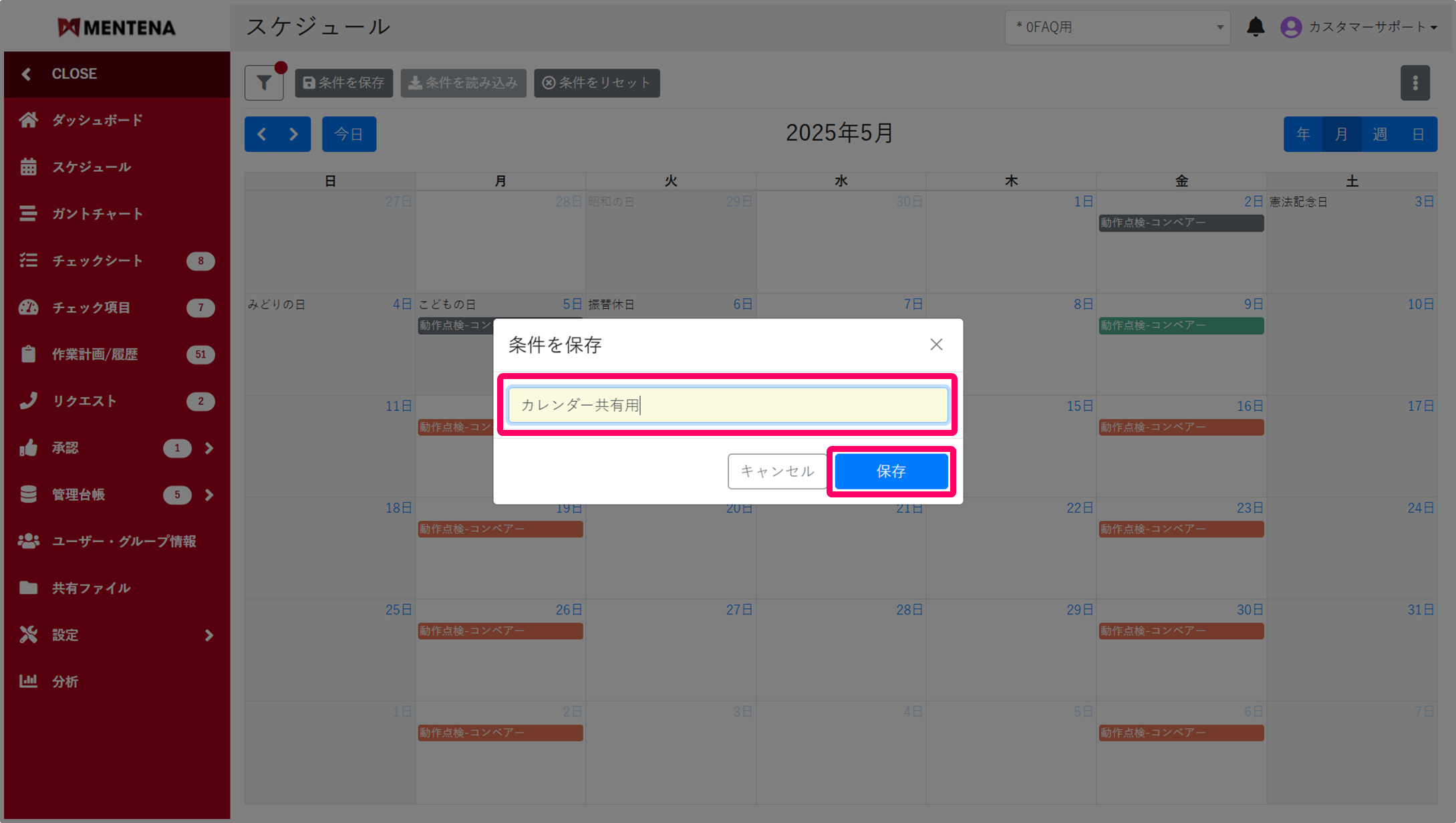 設定が完了したら、「条件を保存」をクリックして名称を入力し、「保存」するとフィルターが保存されます。