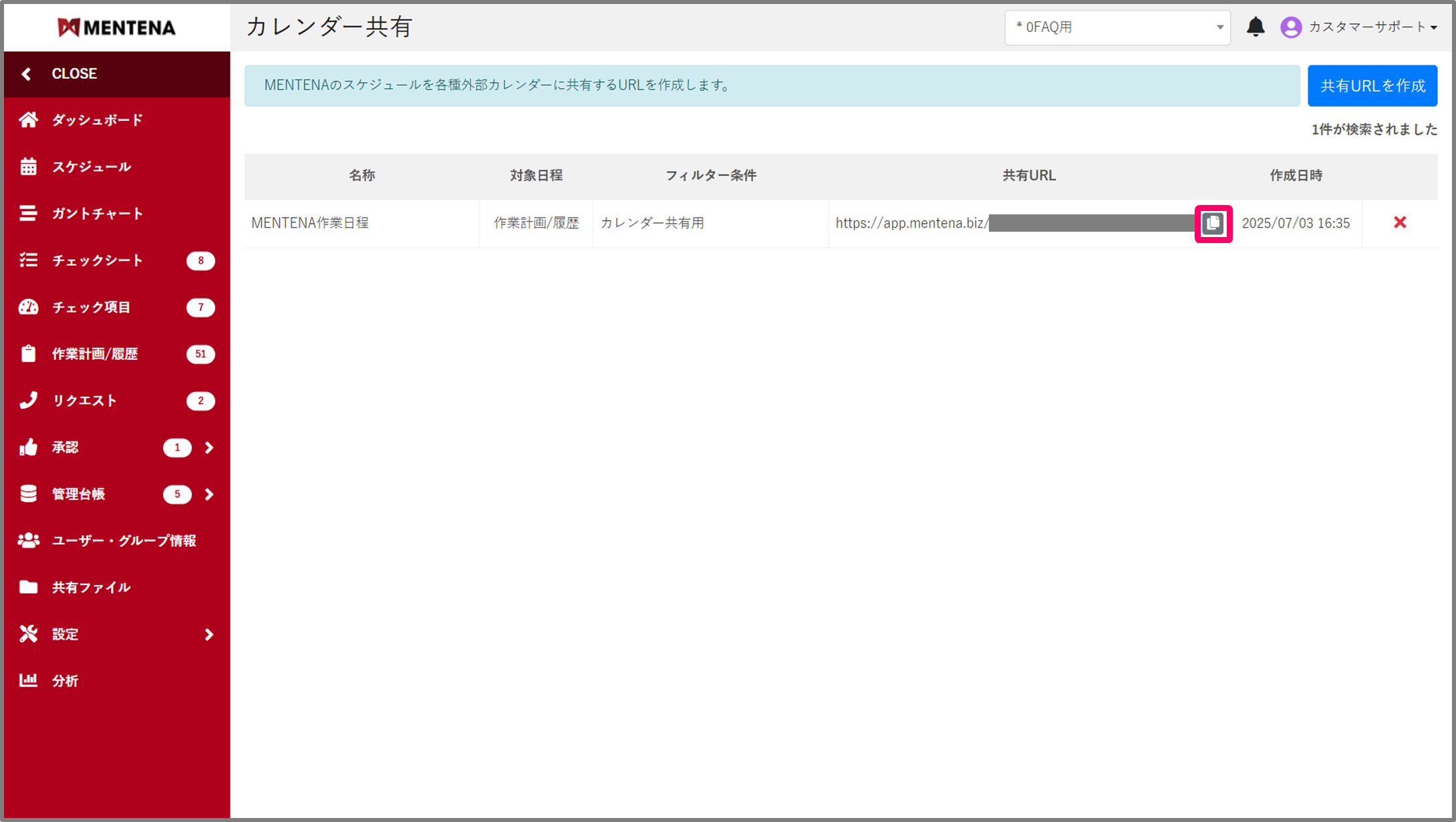 カレンダー共有一覧に発行した共有URLが追加されます。