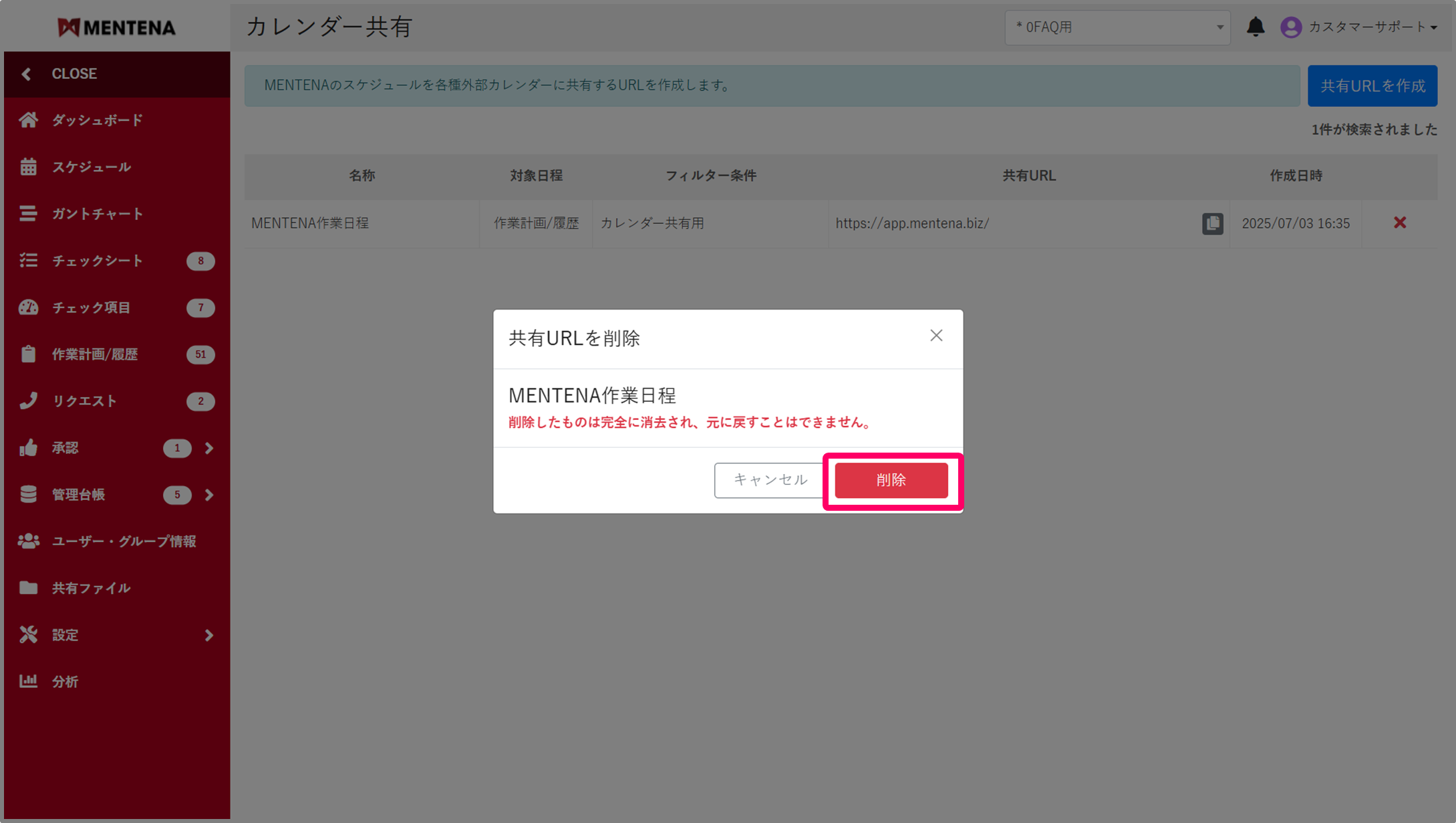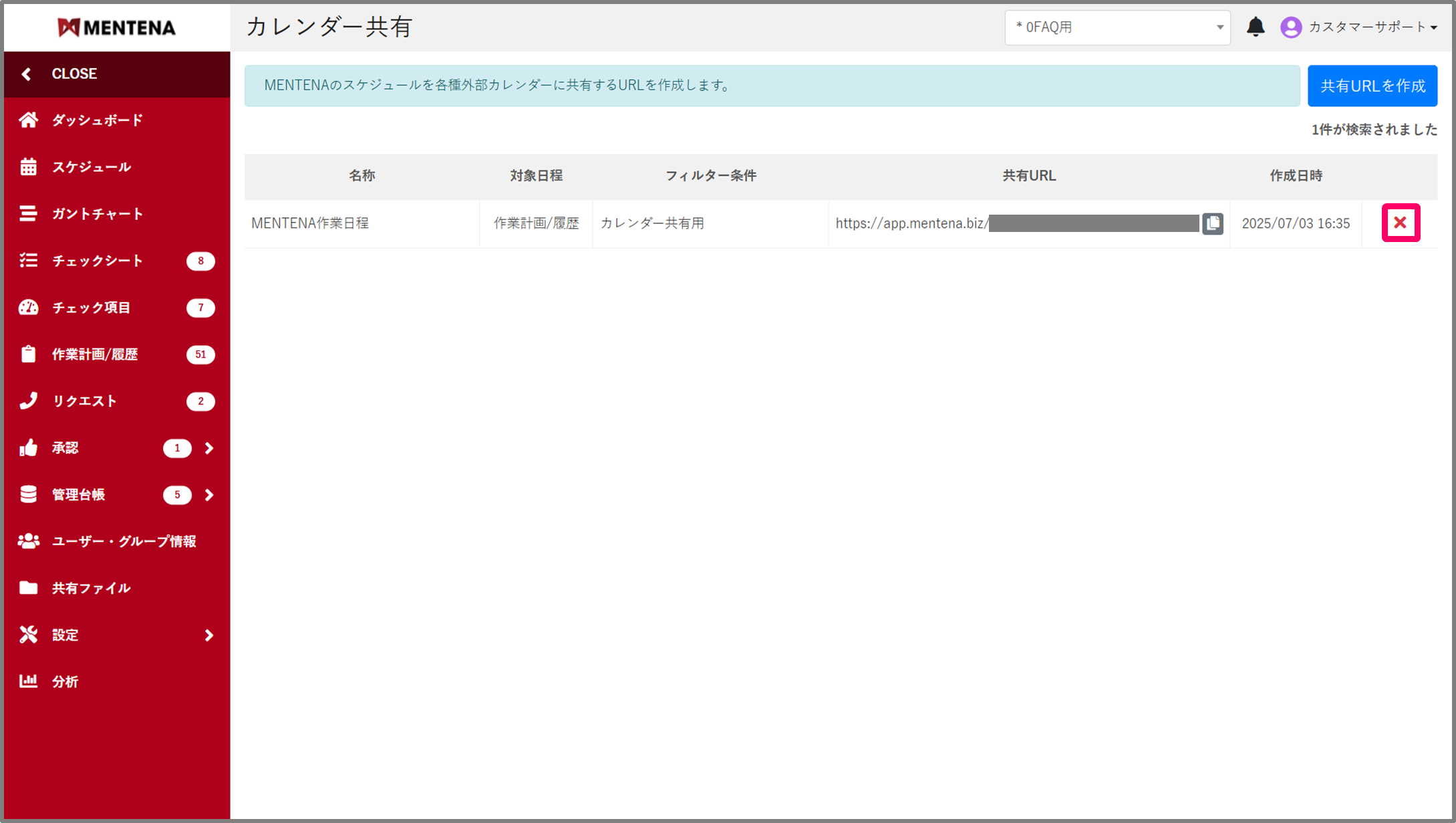 カレンダー共有一覧画面の右端にある✕をクリックすることで、共有URLを削除できます。
