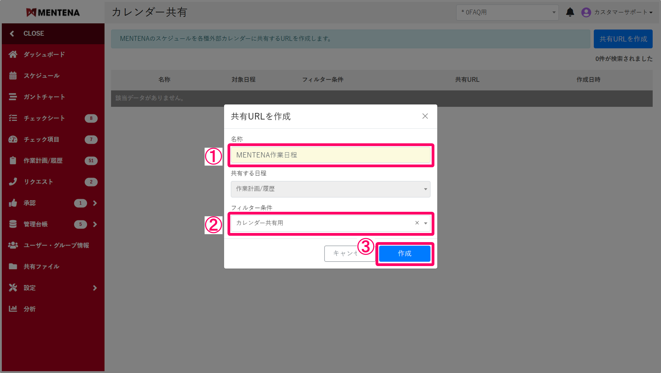 ②共有する内容をフィルター条件で選択して、③「作成」をクリックします。